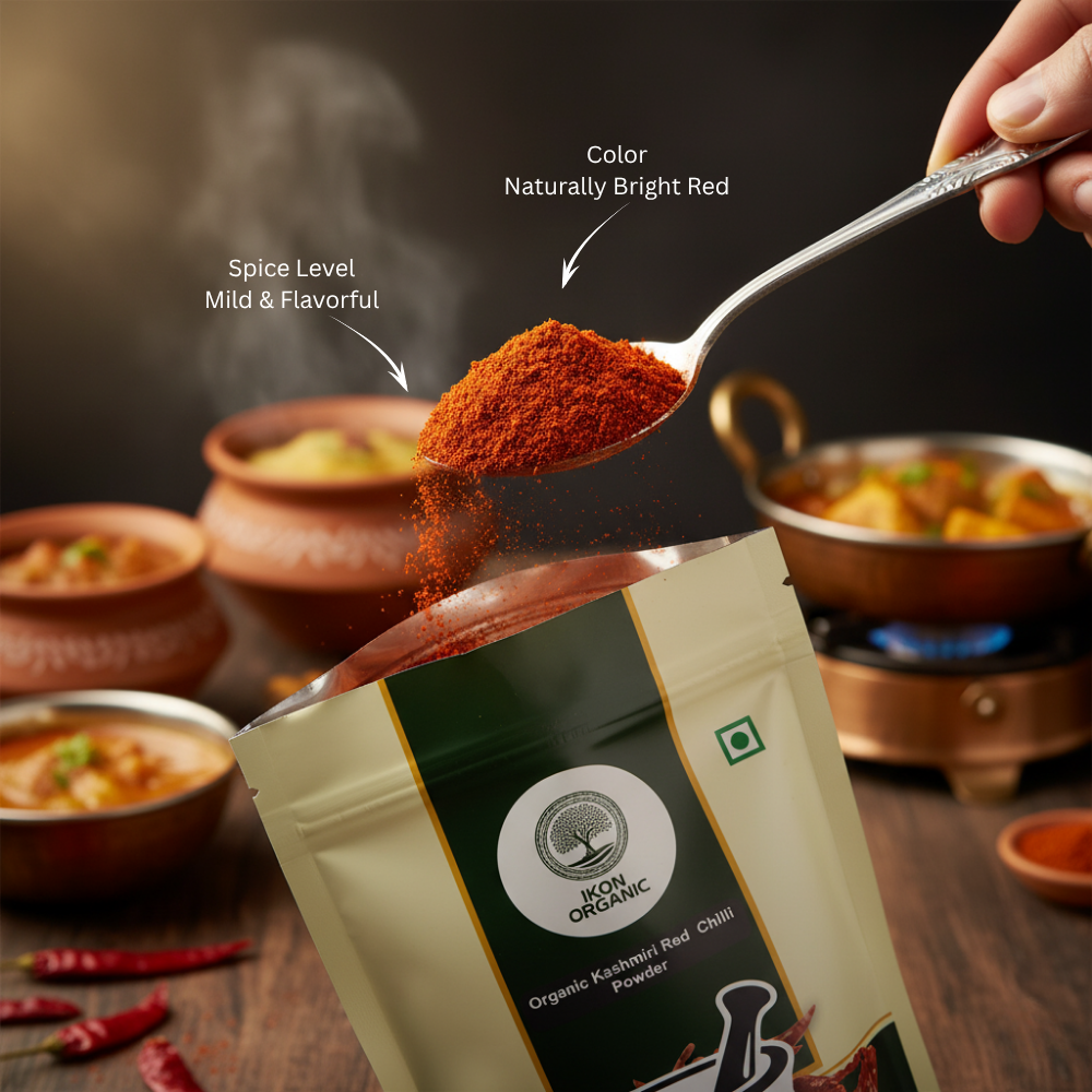 Add the perfect balance of color, taste, and aroma to your dishes with IKON Organic Kashmiri Red Chilli Powder, a must-have spice for every Indian kitchen.